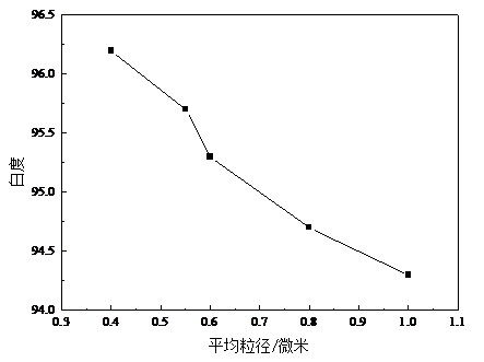 图2中5个样品的平均粒径为0.4、0.55、0.6、0.8、1.0μm,这几个样品除粒径不同外组分完全相同,将这几个样品用MS-350白度测试仪测量,得到的结果见图3。