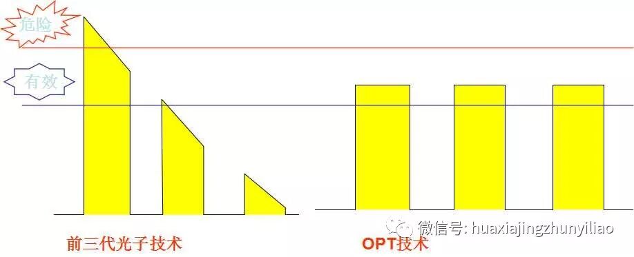 (一)原理:在用于脱毛时,虽然IPL作用靶点为黑素,但是其真正的生物靶点却是位于毛囊隆突部的干细胞。所以,要达到脱毛的目的,需要黑素吸收光能,光能转化为热能后,摧毁毛球和毛囊干细胞。对于毛囊黑素而言,最大的波长吸收范围为590 ~ 900 nm[7],而表皮黑素也可竞争吸收此波长光。但是,在一定范围内,波长越长的光,穿透能力越强,则表皮黑素吸收越少。因此IPL脱毛适用于浅肤色患者,深肤色应慎用。