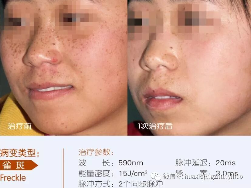 治疗参数:设定的关键需依据患者的肤色、敏感程度、耐受程度。如肤色白、皮损色泽较浅、较能耐受的患者,需适当缩窄脉宽,缩短间隔时间,提高能量密度,以便得到满意的临床效果。反之,对肤色较黑或色素斑颜色较深者,则需相应延长脉宽及间隔时间,以提高安全性、减少不良反应。