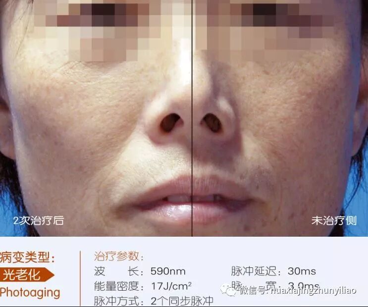 1. 长期治疗:IPL的长期治疗能有效促进色素代谢,促进皮肤新陈代谢,同时启动皮肤修复机制,促进胶原纤维和弹性纤维的增生和重排。经过多次温和的治疗,对改善肤色和皮肤质地(光滑度、细腻度等)、提高皮肤弹性等效果明显;对改善细小皱纹、毛孔粗大的问题有一定效果,但对改善皮肤松弛作用较弱。通常需要2 ~ 3次IPL治疗才能取得较为理想的效果,若要达到更好的疗效,则需一个疗程(至少5次)的治疗。
