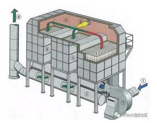 2、第二阶段开始时是用附加的加热器加热一股气流,利用热气流去加热吸附饱和的活性炭,将被吸附的有机成分激活气化而从活性炭中脱附逸出。恢复活性的活性炭即可以重新吸附有机成分的气体分子;