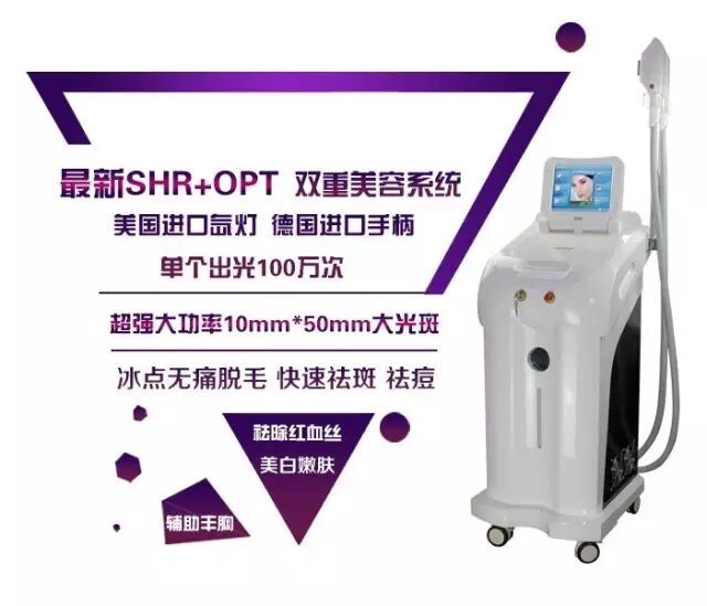 OPT目前市场上性价比较高的一款美容仪器了,是目前世界上先进的强脉冲光加射频技术,SHR+OPT双程序结合的美容系统,SHR系统以超大功率,快速出光的优势可快速滑动治疗,效果可媲美专业的德国冰点808nm激光脱毛;OPT系统利用平顶方波技术,双波长截止技术,使得出光更均匀,治疗效果更显著。还可以祛斑、嫩肤、除皱、淡化红血丝的功效。