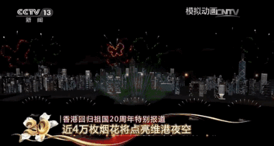 需要为大家预告的是,为庆祝香港特别行政区成立二十周年,今天晚上8点将在维多利亚港举行烟花汇演。这次烟花汇演时长23分38秒,将燃放3万9888枚烟花。
