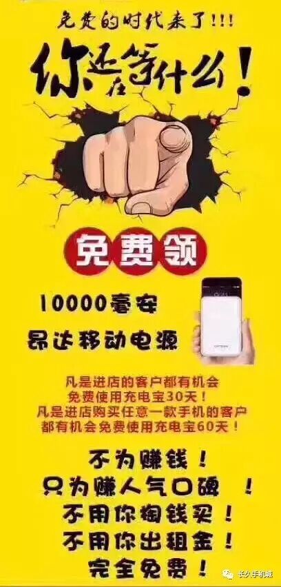 手机电池不耐用!临时出门不耐用!游山玩水不耐用!王者荣耀不耐用!反正都是不耐用!不用玩钱买,免费拿走用,进店即可领取!不为赚钱,只为赚人气、口碑,不用你掏钱买,不用你出租金。