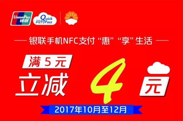 2017年10月至12月期间,在河北中石油指定加油站使用银联NFC手机支付在便利店购物,每个便利店每月前50名享受单笔满5元立减4元(封顶)优惠。仅限绑定62银联卡生成的NFC手机支付,数量有限,先到先得,单卡单月限享受一次优惠。