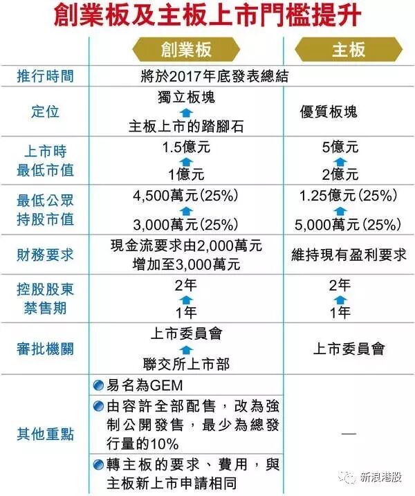 至于主板的改革建议,包括:最低市值将由现行的2亿港元提升至5亿港元,但公众最低持股量必须达到1.25亿港元;新股上市后股东的禁售期也将延长至2年。