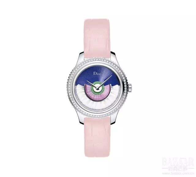 灵感来自一次传奇性威尼斯的“世纪舞会”,DIOR VIII GRAND BAL系列腕表搭载迪奥独有的专利“DiorInversé 11 1/2”自动机芯,表盘装有前置摆陀,42小时动力储备,Dior专利镂空摆陀上镶嵌有类似高级礼服的编织或蕾丝般精致的钻石,不同的羽毛或者其他宝石类材质的装饰,灵巧的摆陀装置如优雅迷人的舞动裙摆,每一款DIOR VIII GRAND BAL系列腕表都仿佛向你翩翩起舞的明艳女郎。