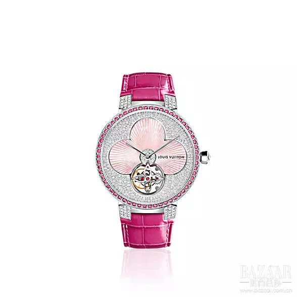百年时装屋以做珠宝的理念精心推出的高级腕表,,花瓣由一整片珍珠母的3D立体雕刻,在珍珠母花朵背面手工上色,呈现精致入微的渐层色彩,镶钻的精钢表圈搭配钻石刻度,系列中的Tambour Monogram Tourbillion 女士陀飞轮腕表还采用了全镶钻的表壳及刻度设计,桃红色和蓝色鳄鱼皮表达色泽饱满生动。