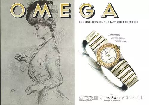 1994年,欧米茄创作的一系列星座系列女士腕表广告,将欧米茄品牌描述为“连接过去与未来的纽带”。广告使用了1904年插图画家保罗·艾利(Paul Helleu)的一幅素描,与一款现代的星座镶钻女表形成了鲜明对照。