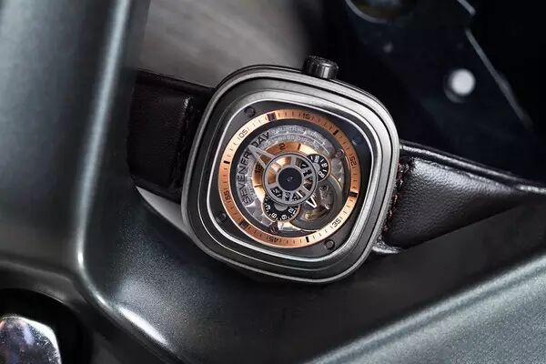 再者,动力界面把内里的复杂机械结构呈现出来,三角形的时针和分针,,衍生出独特的设计,使每款Seven Friday腕表都给人独一无二的视觉观感。