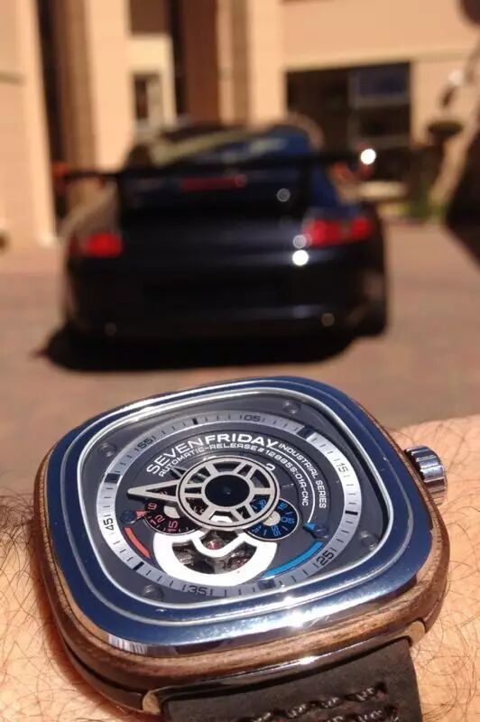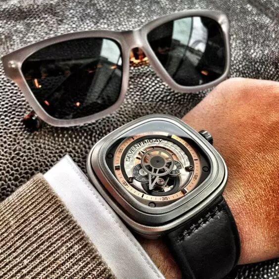 Seven Friday采用盒子与动力界面的概念。标志性的方形外壳,跳脱出传统钟表的圆壳概念。配合不同的款式,围绕不锈钢表壳的方形外圈采用不同的材质和加工方式制造,塑造不同的视觉效果和触感。