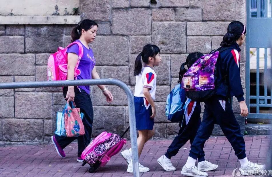 拖着沉重的书包的香港小学生和帮忙背着书包的家长