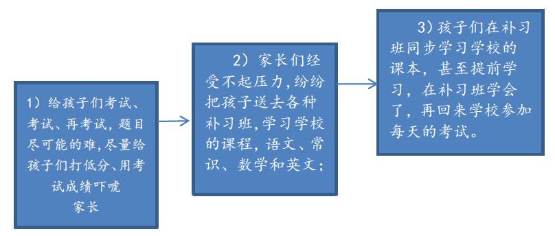 学校里几乎天天考试,老师通过考试进行教学。老师上课就发卷子,考完了,提供标准答案,让同学们互相批改。孩子们对考试永远忧心忡忡,而且家长也认为孩子功课不好,会给孩子施加很大心理压力。我:“老师为啥不先教再考呢?”,孩子说不知道。我又问她:“其他同学知道答案吗?”,她说大部分知道,因为他们在补习班学过了。