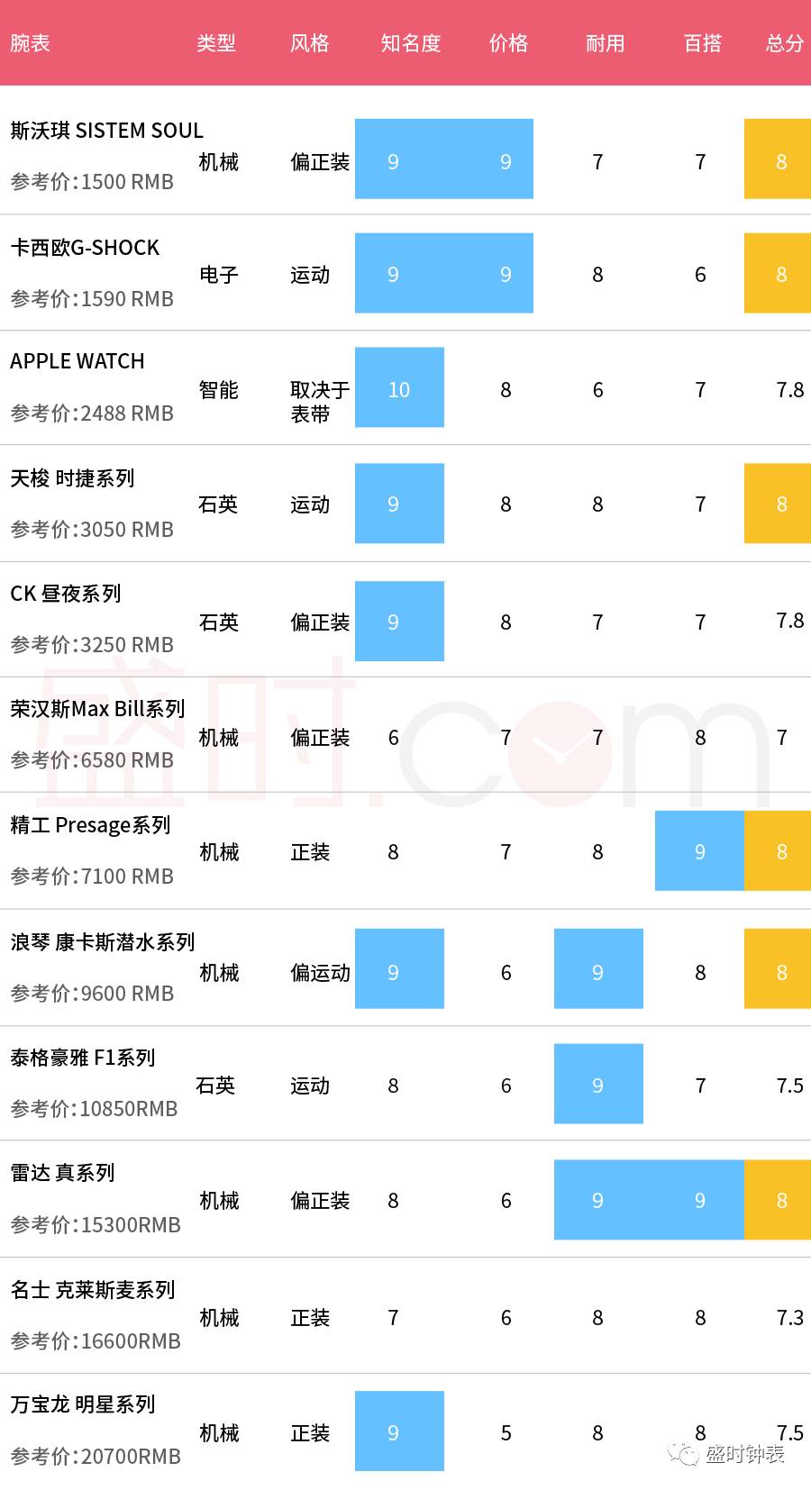 耐用:越耐用,得分越高,一般和材质相关,如皮表带相对金属表带寿命更短