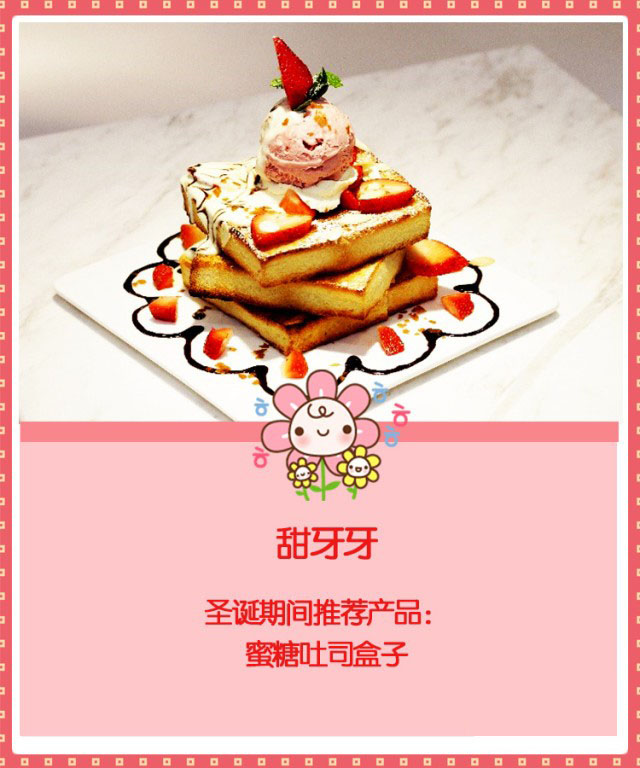 甜牙牙是香港近来人气非常高的甜点名店,经常一位难求。店铺主打华夫饼系列,雪糕、蛋糕和咖啡也各有千秋,卖相十分讨好。今年圣诞推出的限定新品——蜜糖吐司盒子!保证让你甜滋滋~好好吃~