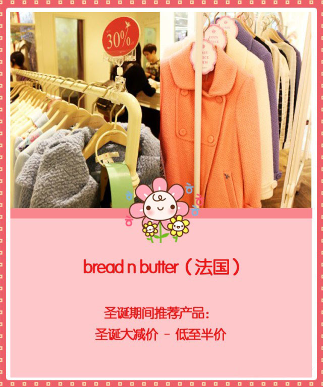 潮流女装品牌bread n butter诞生于法国巴黎,店铺遍布全球。其简约的版型加之独特而巧妙的细节点缀,成为了此品牌的独特风格,深受年轻女性的喜爱。今年圣诞,bread n butter更罕见地推出了低至半价的圣诞优惠,为女性们送上最贴心、实惠的过冬礼物。