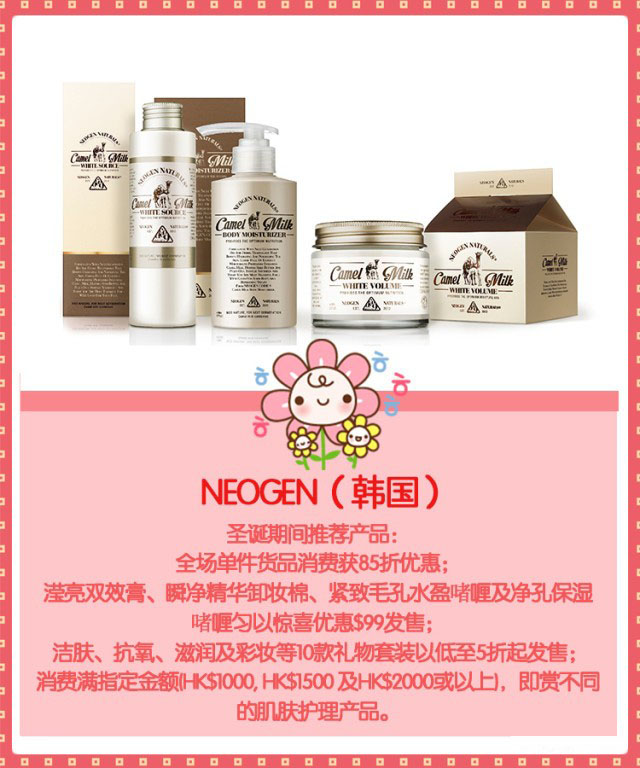 韩国医学护肤新贵NEOGEN透过网购及电视购物平台突围而出,去年以仅次雪花秀及THE FACE SHOP的排名、登上韩国市场协会的韩国畅销产品—药妆类排行榜。许多韩国明星都是其忠实粉丝,如少女时代的侑莉推荐的黑冻水润面霜,《我们结婚了》女星吴妍书大爱的海洋水溢精华,被视作帮助韩国女星打造水润肌肤的秘密武器。如今,继开拓新加坡、台湾及泰国等的亚洲网购及电购市场,NEOGEN也在香港开设门店了!