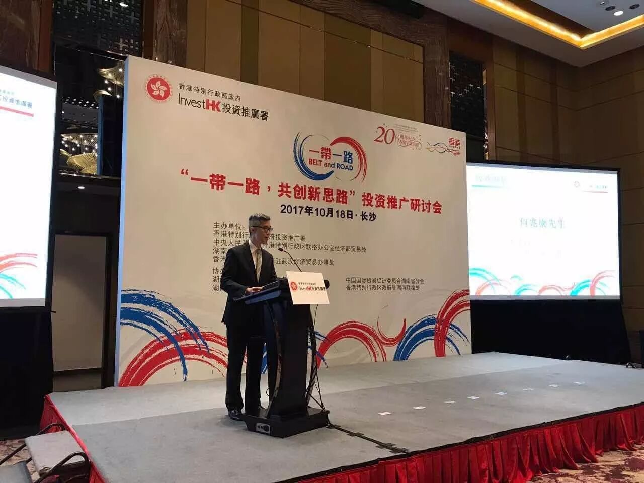 香港投資推廣署十月十八日於湖南省長沙市舉辦「一帶一路,共創新思路」投資推廣研討會,向當地企業介紹香港在國家「一帶一路」倡議下的獨特作用,以及當地企業如何利用香港的營商優勢拓展海外市場。研討會上介紹了香港的營商環境和投資推廣署的免費服務、香港的最新企業財資中心稅務優惠政策、香港金融專業服務、香港作為亞太區國際法律及爭議解決中心的優勢,以及香港證券市場的最新發展。