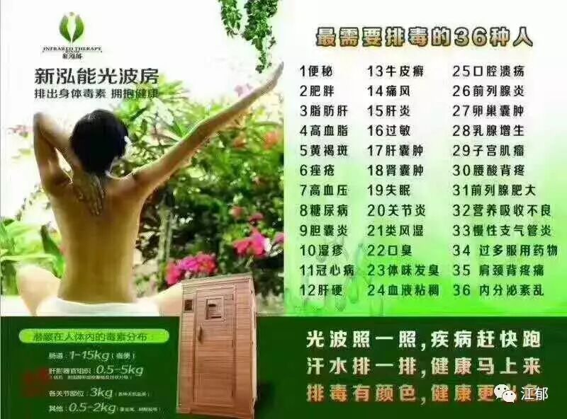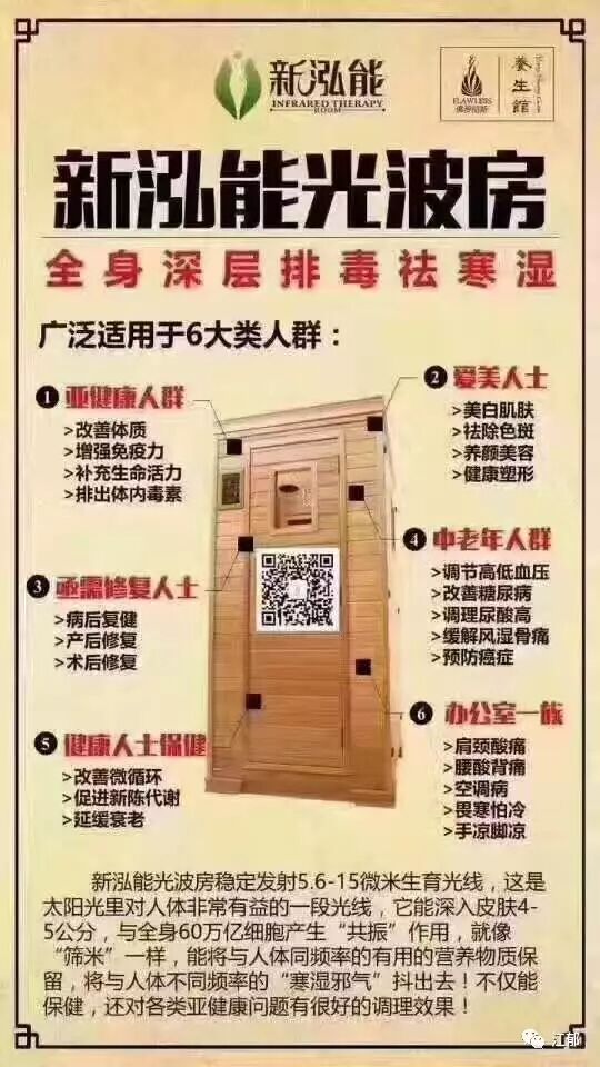 缓解疼痛:远红外可扩张毛细血管,促进血液循环,增加病痛部位的供氧量,所以能起到消炎,减少疼痛的作用。对治疗风湿,关节炎,要背疼痛等特别有用 美体塑身:光波照射可以排除体内多余脂肪,达到减肥、塑身功效。