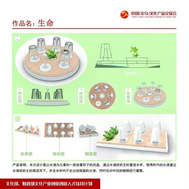 形态细节上,圆形茶盘上有六个独特的沥水柱来支撑杯子,支撑柱底盘有两圈凹槽,当杯子插入柱中摆放,渗漏的水会滴入凹槽中,像是水滴溅起的波纹。茶盘中间的圆形可放置小植物。流入凹槽中的水得到循环利用,供给植物水分。