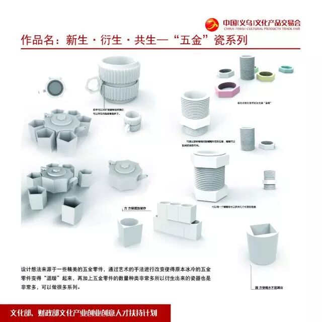 共生——五金零件中螺帽和螺母的共生关系,在瓷器中也可以利用并且成为特色,形态细节上五金造型的瓷零件的拼接组合,形式美和整体达到和谐统一。色彩和材料上,整体瓷质材料,具有一定的观赏性和实用性,视觉语言简约,留有遐想空间。