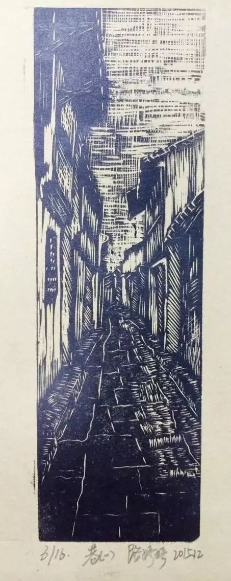 作品选用了黑白木刻的方式,首先定稿,其次刻出底板,直至呈现作品的最终面貌,并且特地采用长构图的形式来表现出古巷的深邃。