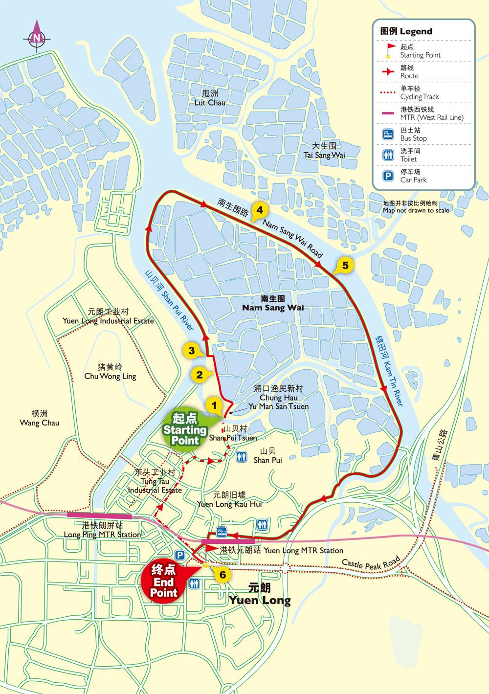 路线:南生围横水渡→赤桉树径→林间空地→南生围路→渔塘教育园地→元朗市中心