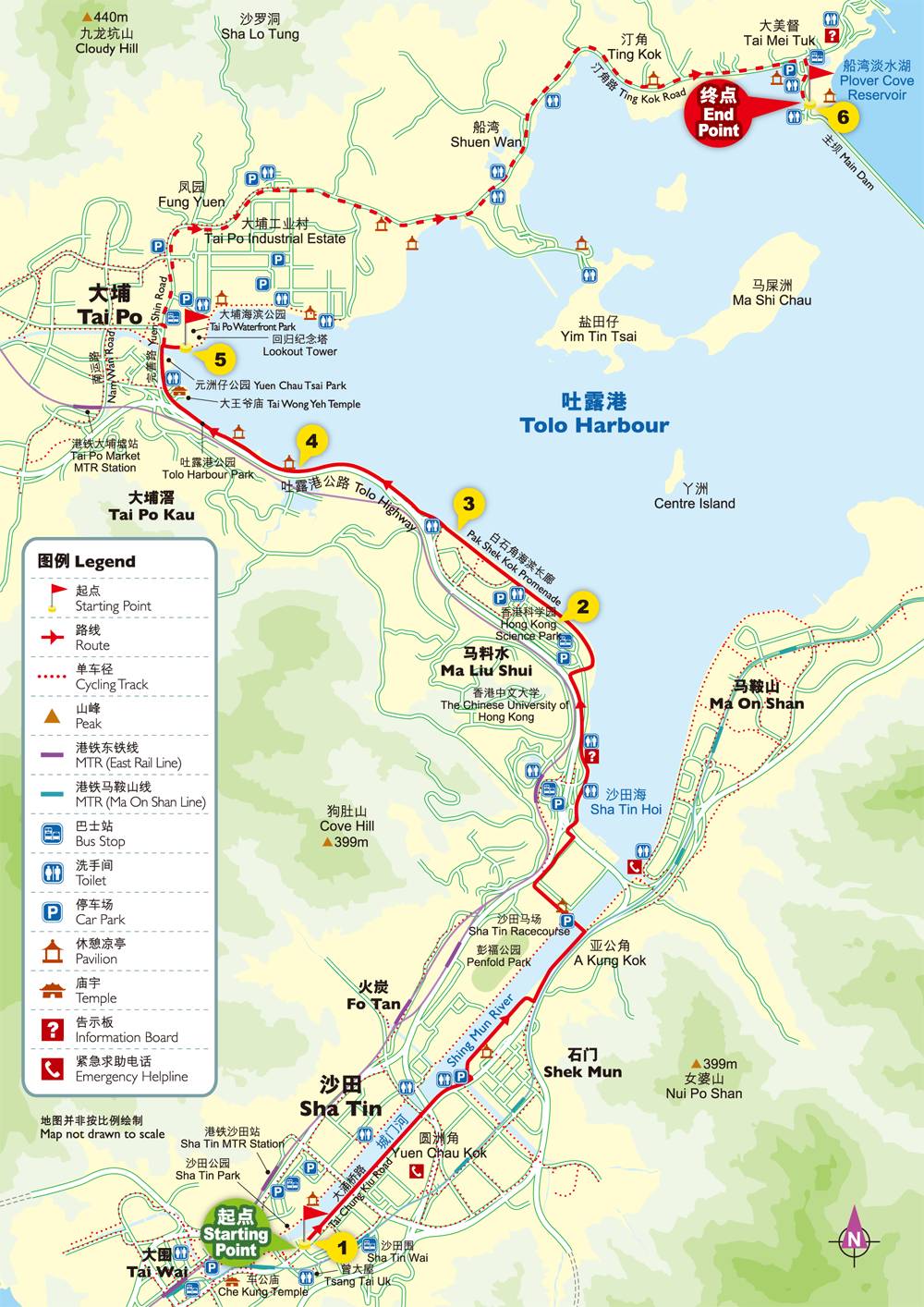 路线:城门河→香港科学院→白石角海滨长廊→吐露港自行车径→大埔海滨公园→大美督