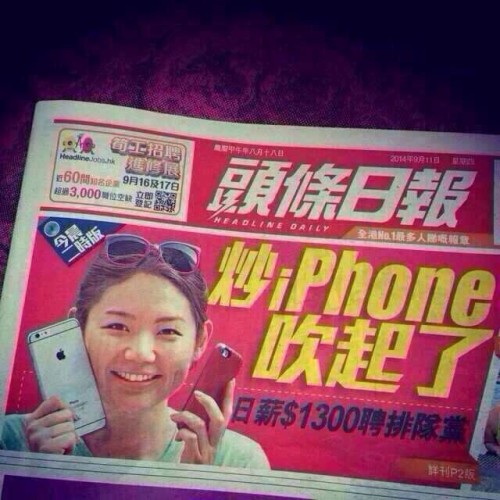 有港媒报道,部分香港买家窥准机会,准备大量入手iPhone6专卖内地。甚至有人在网上发帖,以1300元日薪招聘大量“排队党”,协助排队购买iPhone6。