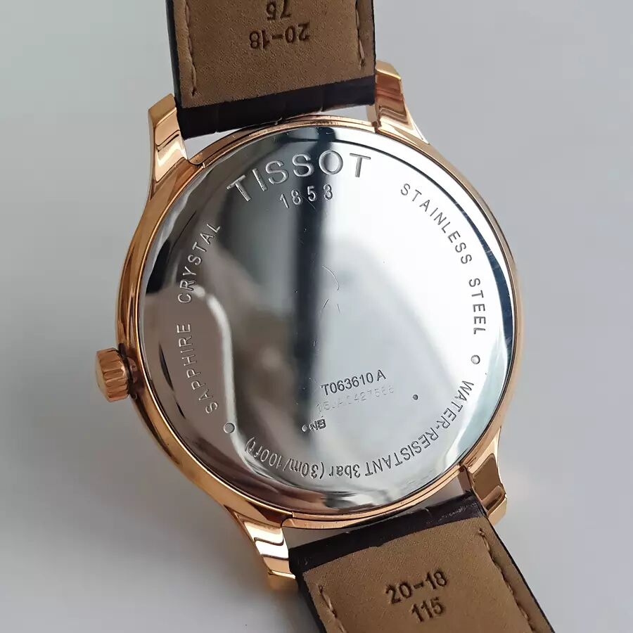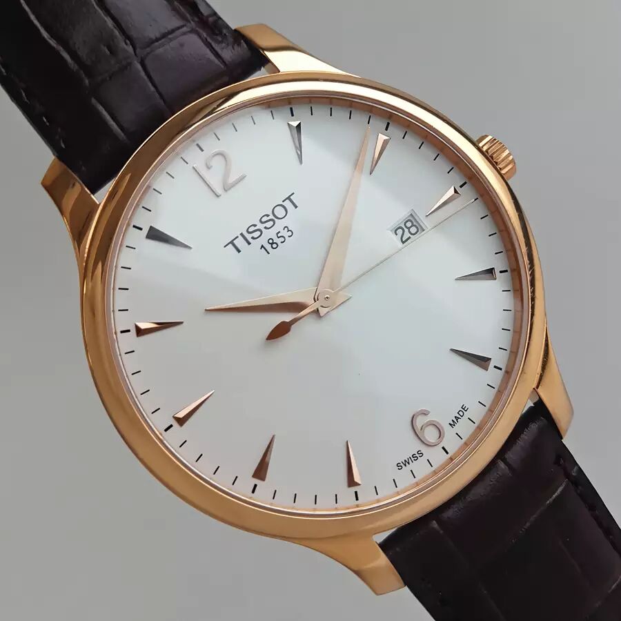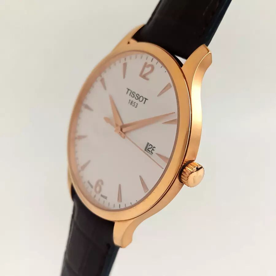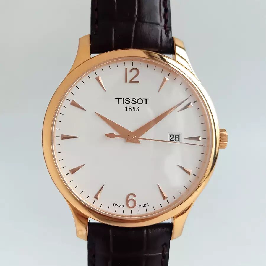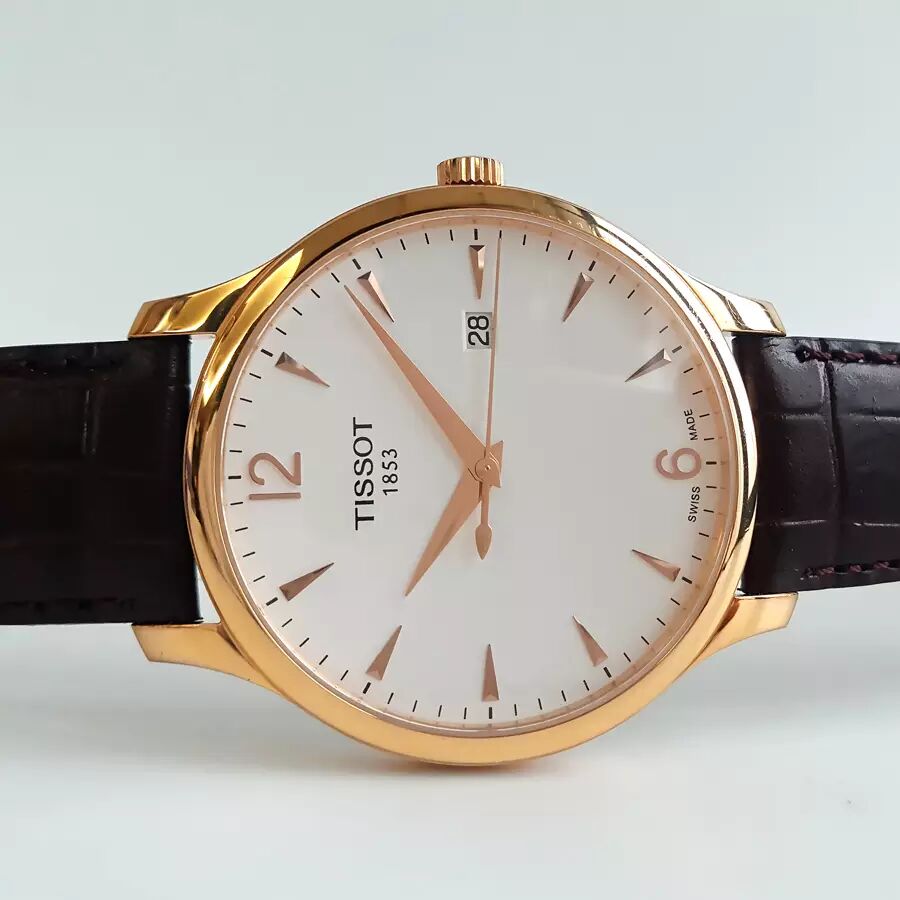 天梭T-CLASSIC系列镀金白盘三针石英腕表。型号:T063.610.36.037.00,整表金色处高贵镀金,42MM大表径,正装休闲都不错。白色表盘,立体钉条+阿拉伯数字刻度,蓝宝石水晶镜面,搭载精准省事的石英机芯,3点位置日历窗口显示,原装牛皮表带,笔直未穿孔,折叠扣。