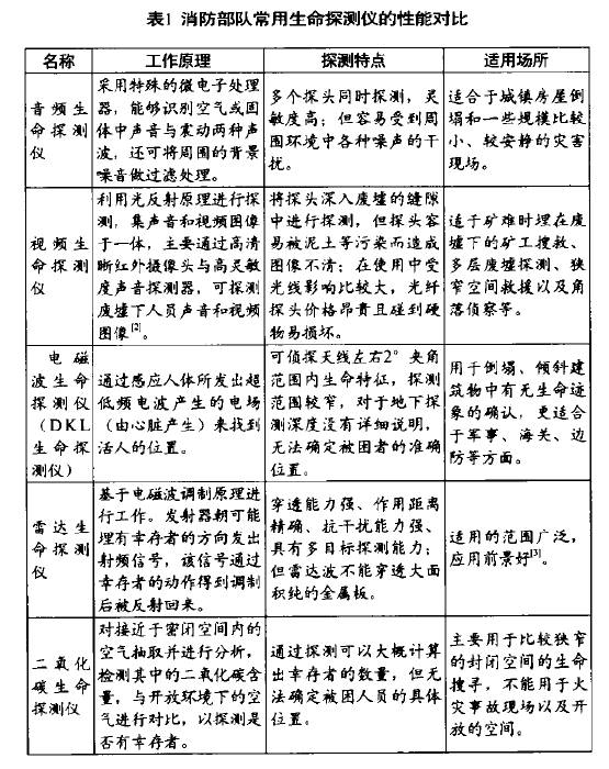 生命探测仪是根据电磁波、声波、光波等物理学再经过滤放大后输出可视或可听信号,适用于地震、建筑物塌方、爆炸、楼房倒塌事故现场的能搜索、探测、寻找生命的仪器设备。按传感器类型不同,一般将生命探测仪分为:音频生命探测仪、视频生命探测仪、电磁波生命探测仪、雷达生命探测仪和二氧化碳生命探测仪。目前,消防部队所使用的生命探测仪主要为前两种,由于雷达生命探测仪价格较为昂贵,消防部队并没有广泛配备,但其实用效果比较好,有着很好的应用前景。下面对消防部队常用的各种生命探测仪的工作原理、探测特点以及适用场所进行对比分析,如表l所示。