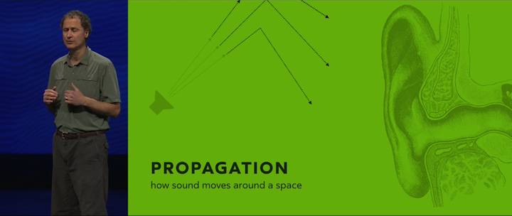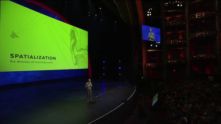 然后是听觉 (Hearing)。Abrash 和 Carmack 都觉得,听觉对好的 VR 体验非常重要 (Carmack 在随后的 keynote 里也强调了这一点),而且现有技术已经比较成熟。但这并不意味着实现好的视听效果很简单。听觉的模拟有三个基本的元素:Synthesis(合成), Propagation(传播), Spatialization(空间化)。