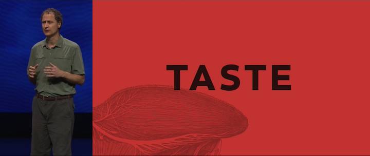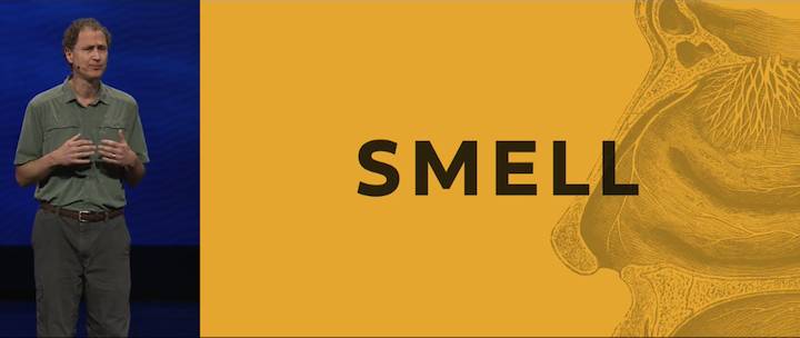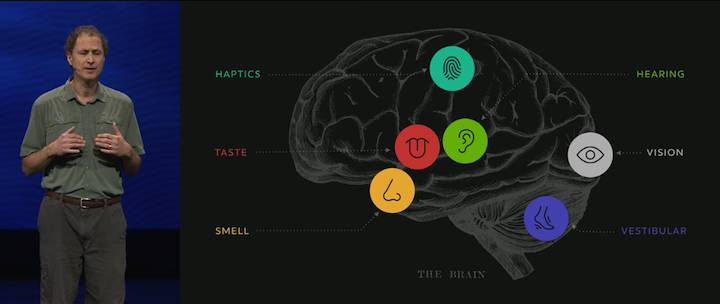 接下来是嗅觉 (Smell)。嗅觉往往与记忆和情绪有着强烈的关联 (has powerful memory and emotional associations) 但非常复杂 (surprisingly complicated)。可能你会觉得在鼻子附近按某种预设的顺序和剂量释放一些气体分子就能很好地模拟了,但实际上气味的传播方式差异很大 (并非均匀散射传播),而我们的鼻子是很敏感的;而且跟三原色不同,并没有那种嗅觉元素 (primary smells) 可以混合成各种我们能感受到的气味 (所以恰当的模拟可能需要几千种不同的分子);由于液体分子的持续性和粘性, (central erasers) 本身可能会产生各种气味。所以总得来说嗅觉的模拟潜力很大,但需要进一步突破性的进展。