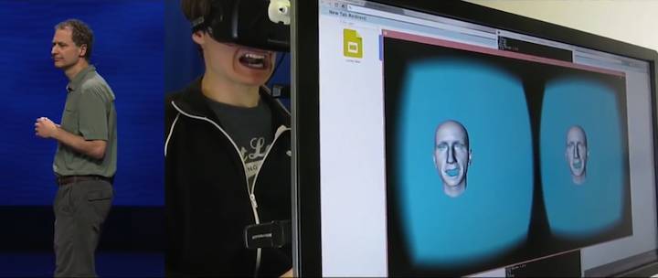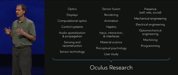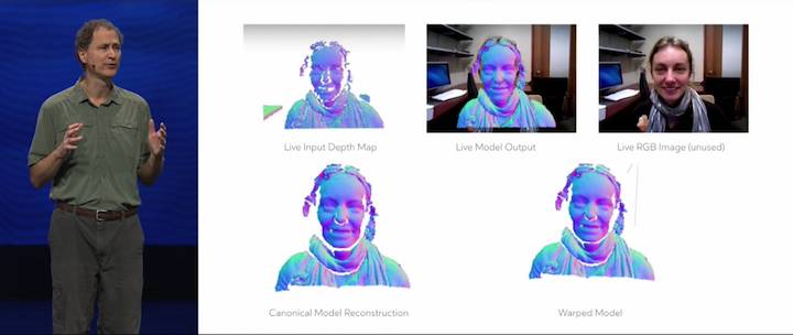Abrash 放了一段视频,头戴设备内的面部表情感知 (与南加州大学的合作),这是其中一个交叉学科研究的例子。