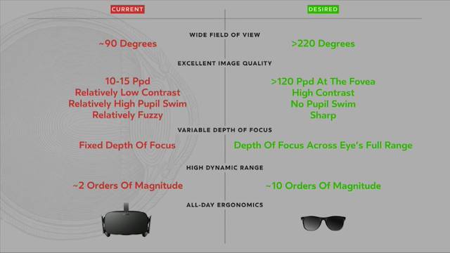 把上面三个领域的这些挑战列一下,就得到了这张表 (可以看做是现在 Oculus Research 的研究课题列表)。