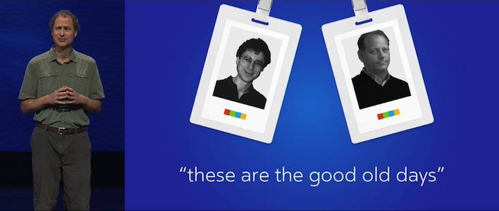 当他 92 年左右还在西雅图为微软做第一代 Windows NT (这货后来居上,淘汰了 Win95/98/ME 的实现,成为后来所有 Windows 的内核基础) 的开发时,有一次开会,他跟行业传奇 Dave Cutler 正好走在一起,两个人没说话默默地走了一段之后,Dave 突然转过来对 Abrash 说:“You know, these are the good old days” 把他吓了一跳,“I don't think I would have been more startled if Dave announced he was a martian.” (就算 Dave 说他是火星人我都没法更震惊了) 当时 Abrash 很不以为然,哥你别开玩笑了好不,天天加班干到吐血,品控严得让人发指,压力这么大你居然好意思说这是“Good old days”,该吃药了吧。