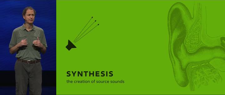 Synthesis (合成) 是源音效的产生过程 (the creation of source sounds)。目前的做法是用预先录制的波形来混合重放,但最终应该是由对物理过程的正确模拟来产生声音的 (比如表面振动)。可以想见的是,这个运算量将会是怪兽级的 (unbelievably computationally intensive)。