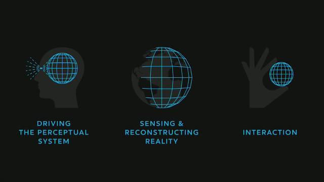 在畅想了一番 VR 对日常生活的巨大变革之后,Abrash 切入正题,“虚拟现实的未来将基于以下三大基础建立起来”,分别是对(人类)生理感知系统的驱动,和对(真实或虚拟世界的)重建和(主体与客体之间的)交互。