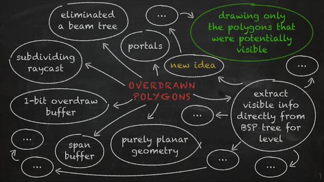 那时卡神才刚刚能让 Quake 实时地跑起来,在那个时间点上,在地图内来回跑动已经比较流畅,但偶尔会非常卡,问题出在过度绘制 (Overdrawn) 上。那时的 Quake 画下了视锥内所有的多边形,当往一个复杂度很高的角度看过去时,很多被挡住的物体被一层层地刷在 framebuffer 上,而那时候还没有有效的可见性检测算法。卡神那时一直在想各种办法,来剔除那些不可见的物体。