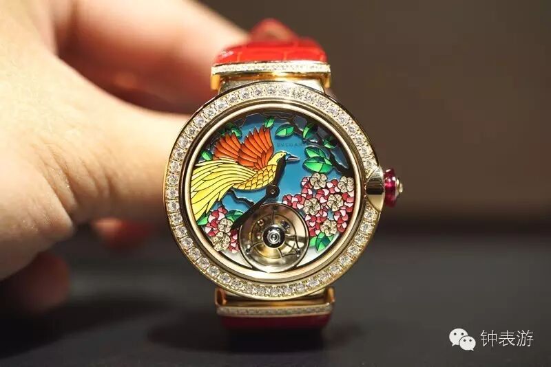 宝诗龙做珠宝起家,高珠宝腕表真的很惊艳。尤其是其中一款蜂鸟腕表,时分表盘位于4时,两只蜂鸟在表盘的上方振翅翱翔。除此之外的腕表其他部分,全部做了镂空处理。鸟的翅膀甚至延伸到了表壳外侧,更有一种栩栩如生之感。