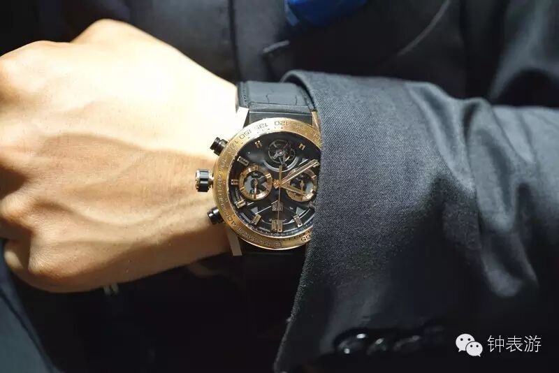 02机芯是陀飞轮加计时,卡莱拉 Heuer-02T COSC瑞士官方天文台认证自动上链陀飞轮计时码表,毫无疑问,一定是今年巴塞尔表展最颠覆价格最有亲和力的瑞士陀飞轮腕表,最最基础的一款陀飞轮表仅售15000瑞郎!懂表的人都知道这个节奏简直是要逆天了...不过我们现场看到的是一款表壳为金和钛材质的卡莱拉陀飞轮计时腕表(这款更漂亮!看下面上手效果),价格略贵,为21900瑞郎,那也是够惊人的瑞士陀飞轮表低价。