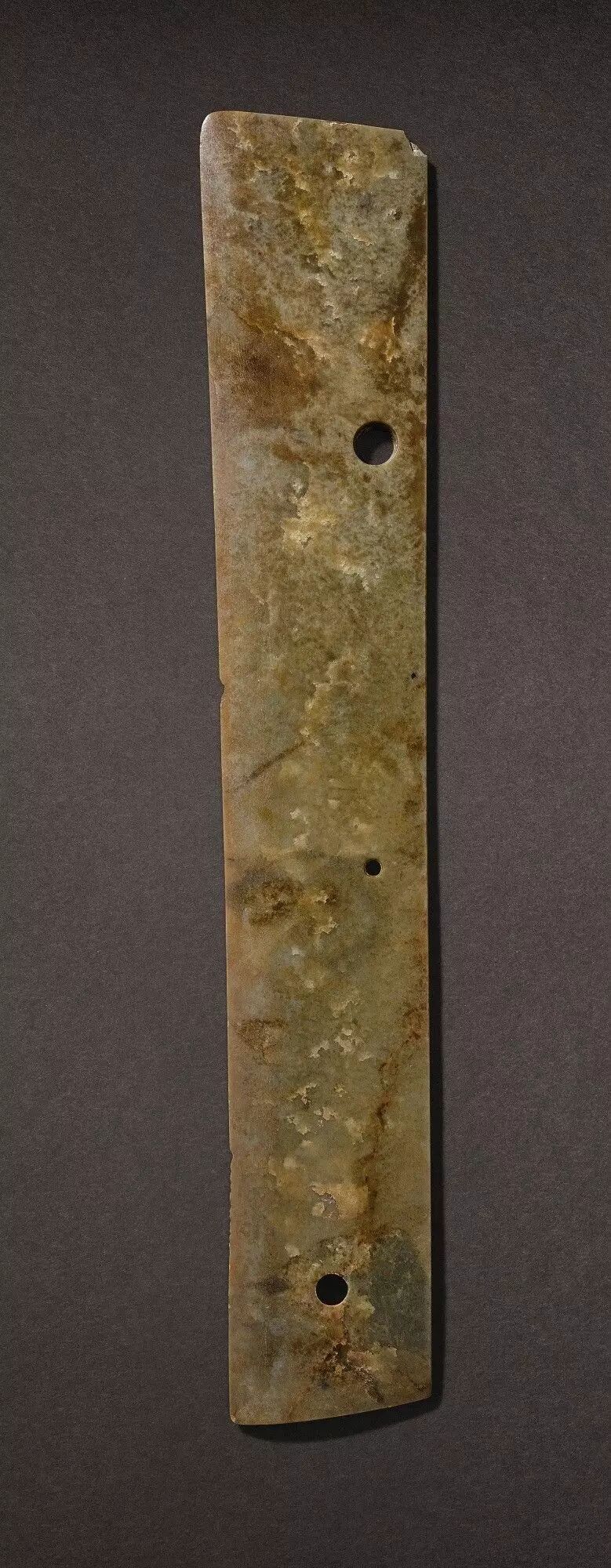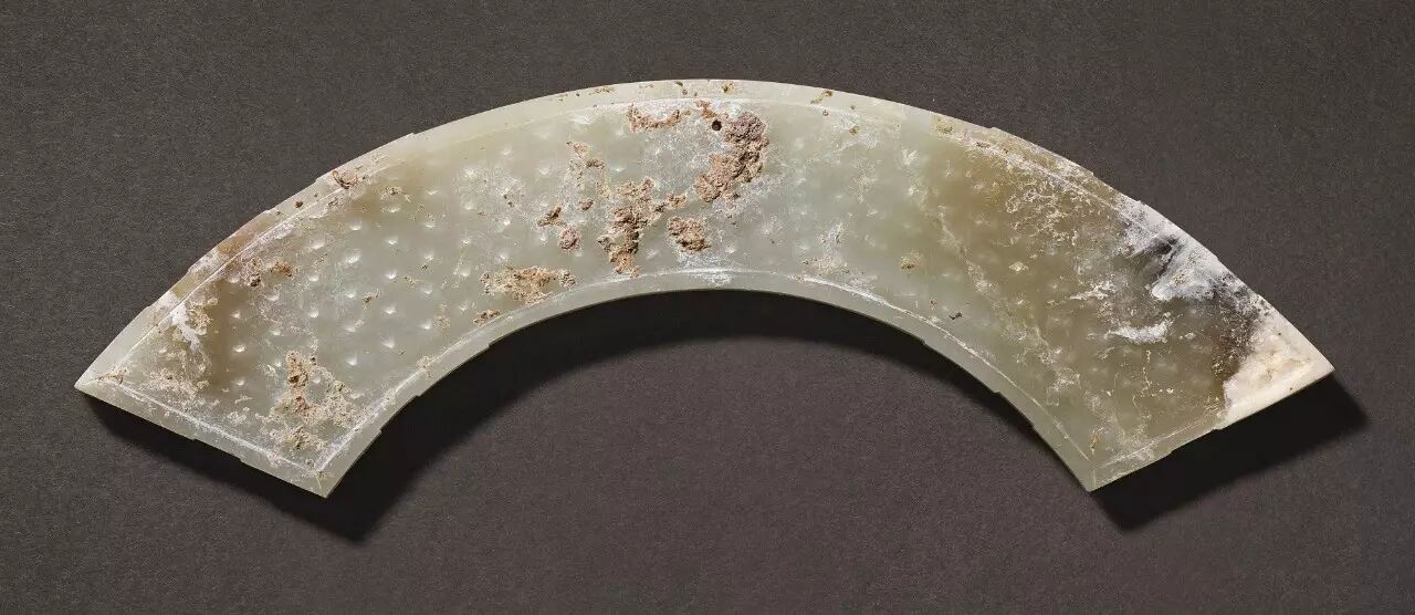 青白玉,浅褐沁,局部鸡骨白,抛光细腻,有玻璃光。生坑玉器,土沁严重。四边起廓,两面浅浮雕细密蒲纹,外廓有数组对称脊牙。珩背中有一单面钻细孔。