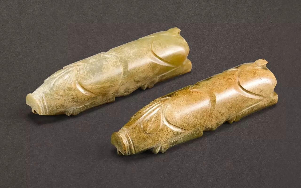 两汉至六朝多作玉豕,棱角明畅,卧伏而陈,为日用及随葬玉作之大类。此类玉豕以寥寥数刀深刻而成,其技谓为“汉八刀”,长鼻下有两孔,通至尾脊,或止于尾上,有如此对。玉豕之用犹待推敲,然墓葬出土见例浩繁,此物多持于墓主人手中。