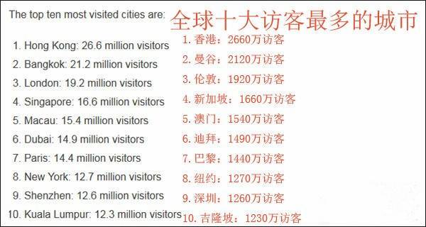 全球十大最多境外游客到访城市依次为:香港、曼谷、伦敦、新加坡、澳门、迪拜、巴黎、纽约、深圳和吉隆坡。
