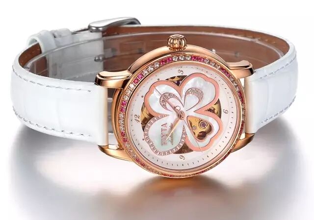 这款腕表表盘尺寸34.5mm,厚度11.6mm。电镀玫瑰金色表壳,质地丰润,不易刮花掉色。白色珍珠母贝盘面采用镂空四叶草元素设计。蓝宝石水晶玻璃表镜,防眩光增透,光学放大清晰读时。