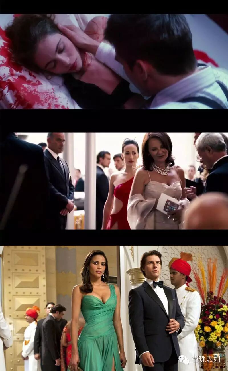 本集性感尤物Rebacca Ferguson在歌剧院穿着一条黄(金)色礼服完成刺杀任务时,看起来整个过程是一条裙子,事实上它有8个版本。阿汤哥和她利用绳子滑到地面时那个版本为了在空中飘逸之美,做了更多褶皱