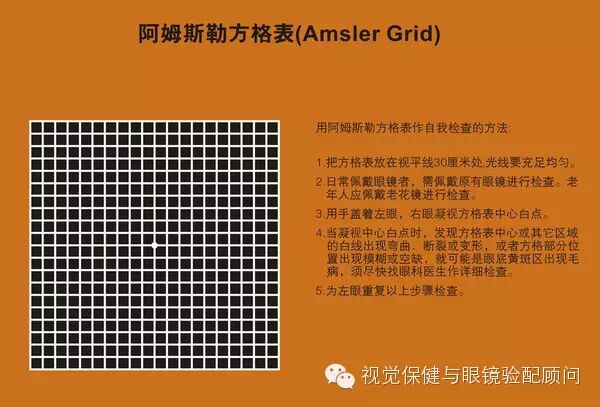 阿姆斯勒表是多个小正方形组成的表格,。检查时,人站在在光线良好处,离阿姆斯勒表30厘米的距离,用手遮住一只眼,然后,。