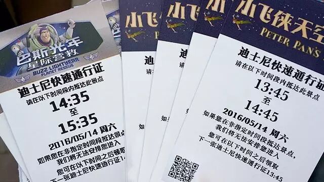 切记,门票不要丢弃,那上面有二维码。扫描二维码,就可以在相应的游乐区内打印出快速通行证(FASTPASS)。在适用主题园区的游客服务中心-快速通行证分发亭内(详见乐园指南标有“快”字图标的地方),扫面门票即可领取,只要在票面上指定的时间内返回该景点,通过快速通道入口不用排队,直接进入。