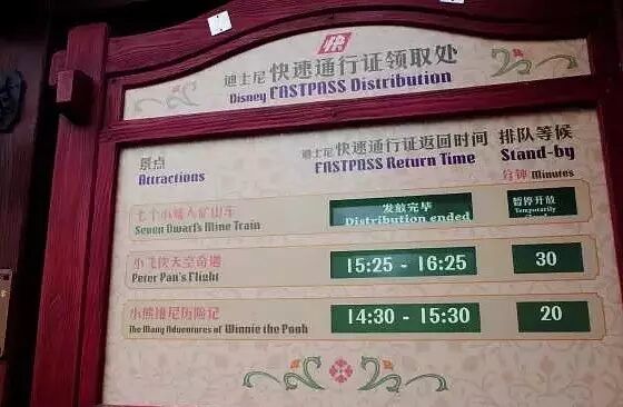 此时,时间的规划很重要,合理利用并根据不同项目的人气度,制订科学的游览顺序。一看排队时间,二看FP。排队时间是每个游乐项目的队尾都会写的,明确告诉你现在开始排队要排多久,负责整队的工作人员会用专门的计算器准确计算,一定要关注这个时间。