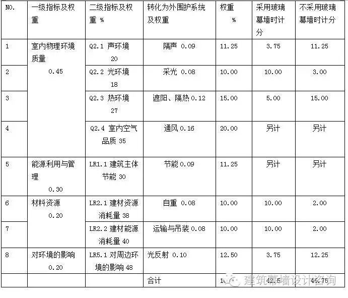 近十几年来,世界各国普遍关注绿色建筑和可持续建筑。绿色建筑关心的中心问题是建筑性能,对生态系统干扰最小化。绿色建筑是指“在建筑生命周期内,包括由建材生产到建筑物规划,设计、施工、使用、管理及拆除等系列过程,消耗最少地球资源,使用最少能源及制造最少废弃物的建筑物。”可持续建筑有四个原则,即资源的应用效率、能源的使用效率;污染防止原则(室内空气质量、CO2的排放量)和环境和谐原则。其理念就是追求降低环境负荷,与环境相融合,且有利于居住者健康。绿色、生态、可持续建筑都是以人的健康舒适为根本。绿色建筑的评估,有四种主要的方法,包括中国绿色建筑评估标准化、美国LEED、多国GBTOOL和英国EcoHomes。中国评价标准主要因素包括节地与室外环境、节地与能源利用、节水与水资源利用、节材与材料资源利用、室内环境质量和运营管理。美国LEED重视建筑性能评价设计使用者的要求,包括健康、安全、保安、功能性、效率、心理舒适性、美观、满意度及技术性能等项。而对建筑幕墙的绿色性质应如何评估呢?首先应在建筑整体、大系统评估要素构成中,针对外围护子系统分析相关诸独立要素和专业间的关联要素。玻璃幕墙轻质高强的特点,对建筑减轻自重、节约地基与基础投入、节省水平垂直运输能耗、材料可回收重复利用、废弃物量少、实现建筑工业化,特别抗震性优良,人性化的采光、视野等有较大的优势。其次,在绿色建筑评估体系的一、二级Q-L权重系数体系中,引出与外围护系统直接相关的指标,包括室内物理环境的声环境、光环境、热环境、室内空气品质;能源利用与管理的建筑主体、节能;材料资源的建材资源消耗量,建材的能源消耗量;对环境的影响的光反射等。(表3)可见当未计自然通风、建筑主体节能两项权重31.25%时,采用玻璃幕墙或不采用两者,“综合”评估差异甚小,几乎相近。应当对室内物理环境质量的热工(15%)、隔声(11.25%)和对环境的影响光反射(12.5%)三项上有所作为,方能改善玻璃幕墙的“绿色”性质。所以幕墙设计应在室内环境质量上对自然通风、遮阳、隔热、隔声上十分重视。在室外对环境的影响上,应对光反射的负面效应多加改善。
